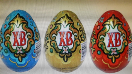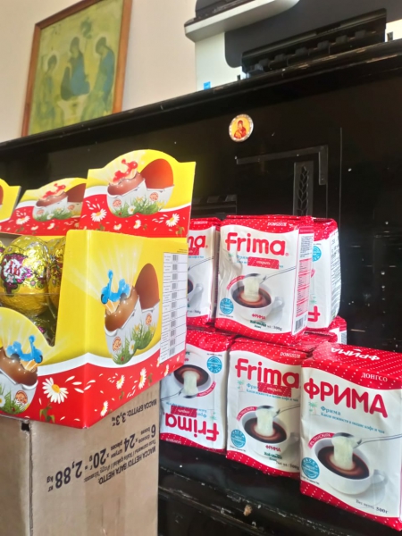 О.Артемий передает о.Вячеславу:1 коробку шоколадных, пасхальных яиц; 1 коробку сухих сливок "Фрима"; шоколадные конфеты "DOVE" c пожеланиями!