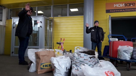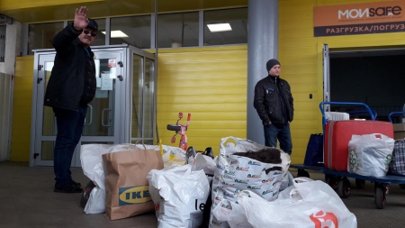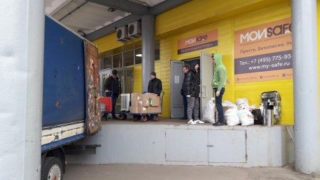 Разгрузка волонтёрами Газели с гуманитарной помощью в Тульской области.